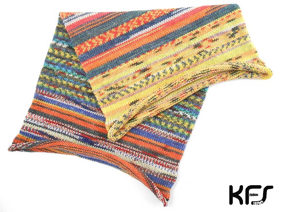 Opalシリーズ毛糸「フンデルトヴァッサー」1430・1431・1433・1435の4色を使用した、カラフルなオンパレードタイプの腹巻帽子です。